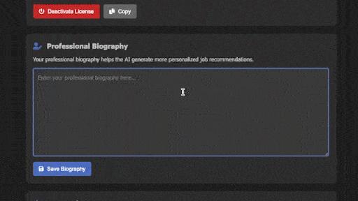 Enter your professional biography, which includes your skills, experience, and tools you use. This helps the AI understand your preferences and improve future recommendations.